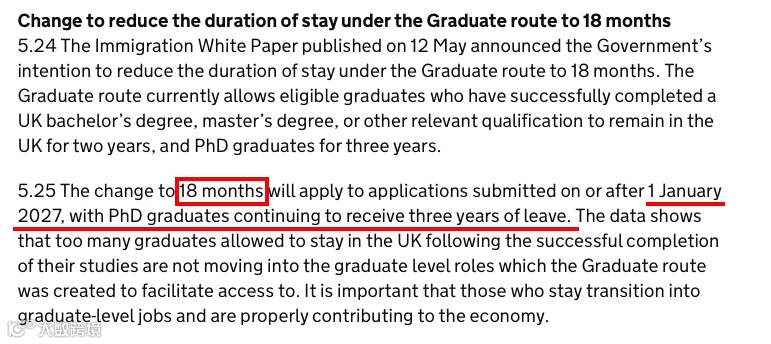 2027年1月1日或之后提交的英国本科、硕士学位或其他相关资格的海外留学生毕业生签证时效由2年缩短至18个月,博士毕业生仍为3年。