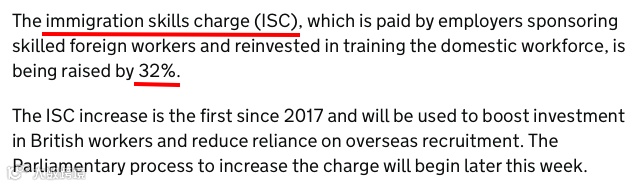 移民技能费(Immigration Skills Charge, ISC)由担保外国技术工人的雇主支付,并用于投资本地劳动力培训。新政中,该费用将上调32%,达到小型企业和慈善机构每名员工480英镑,中型和大型企业每名员工为1,320英镑。