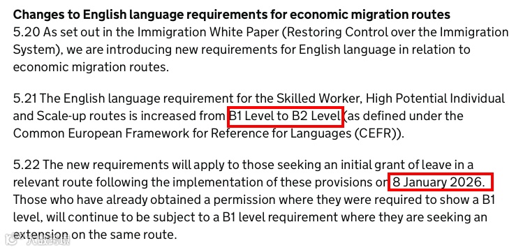 根据新政,从2026年1月8日起,技术工人签证(Skilled Worker)、高潜力人才签证(High Potential Individual, HPI)和规模扩张签证(Scale-up)的英语要求已提高至B2水平,申请人需证明具备在英语国家独立生活、工作与学习的能力。