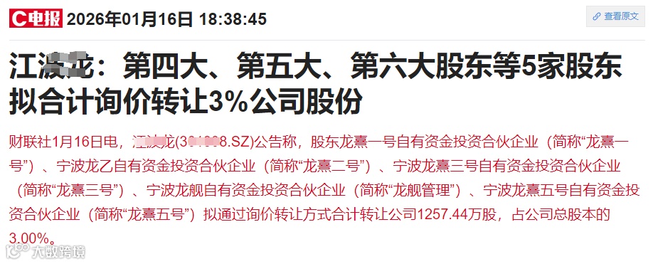 临近过年,减持改善生活的上市公司,也多了起来。此外,还有公司,通过“询价转让”这种方式,变相减持。比如我们此前曾谈到过的存储标的江波L:第四大、第五大、第六大股东等5家股东拟合计询价转让3%公司股份。