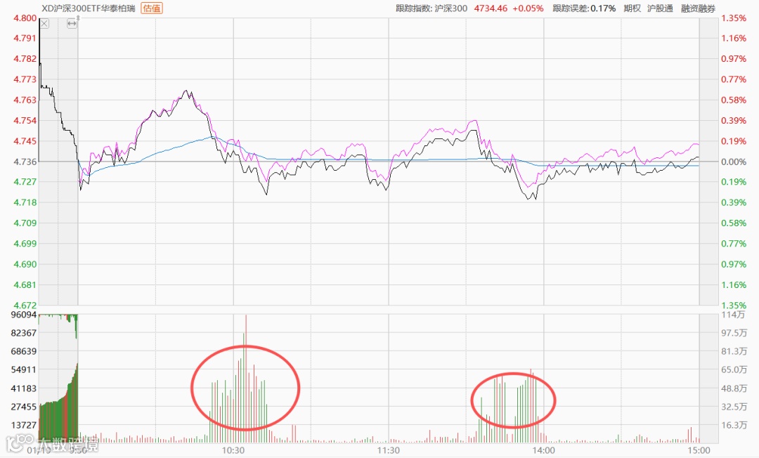 我们以沪深300ETF为例,今天上午及午后,分别出现了两波较为明显的放量下跌,正好对应着指数的回落。