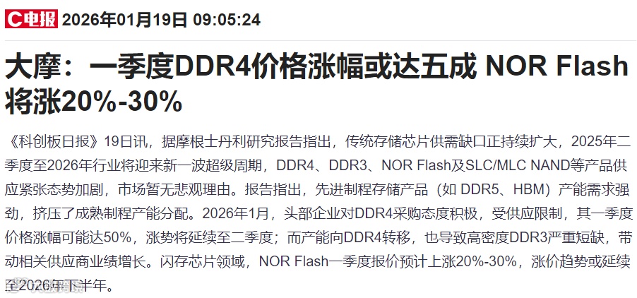 ②存储涨价。大摩预估,一季度DDR4价格涨幅或达五成 NOR Flash将涨20%-30%。