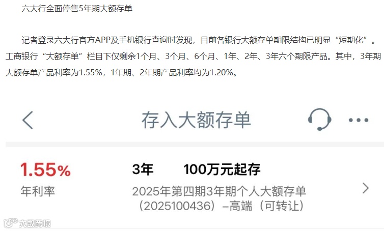 昨天盘后,有媒体报道,六大行全面停售5年期大额存单。不仅如此,工行还将新一期3年期大额存单,起售门槛提至100万,而年利率仅为1.55%。