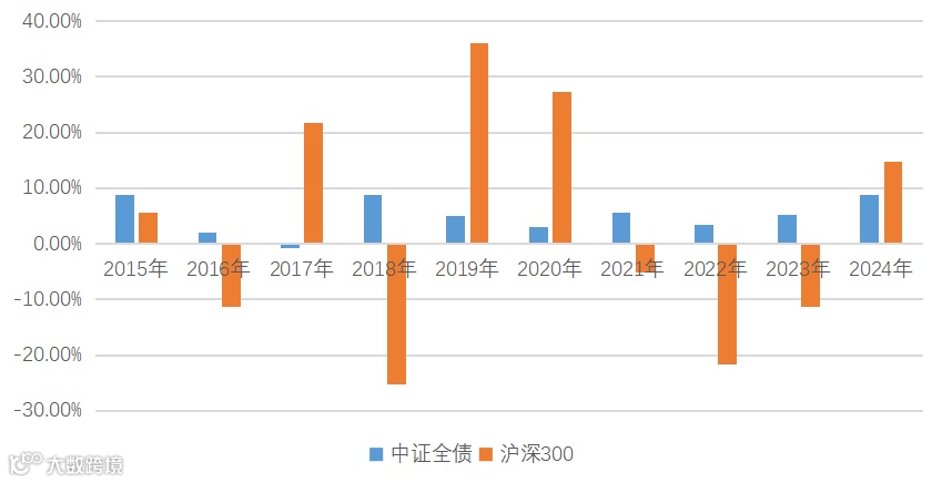 数据来源:Wind,2015.1.1-2024.12.31,中证全债指数代码H11001,沪深300指数代码000300。历史数据不代表未来表现。
