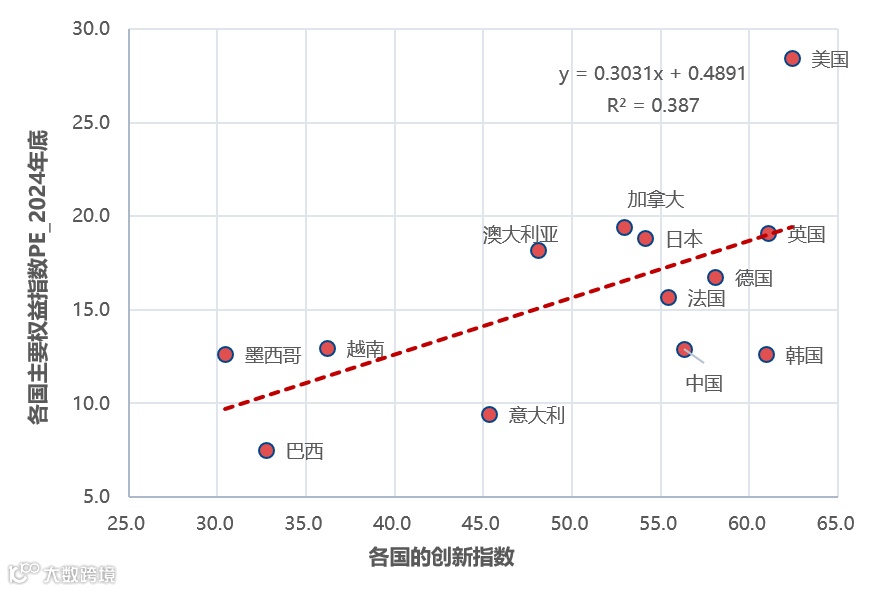 从股市定价来看,全球主要权益指数的估值与该国家的创新水平呈现一定的正相关性。相比同等创新水平的国家,比如法国、日本等,中国股市的估值水平仍明显偏低,说明了市场尚未完全定价中国的创新能力,随着海外投资者重塑对于中国创新能力的认知,这一估值差距可能会继续缩小。