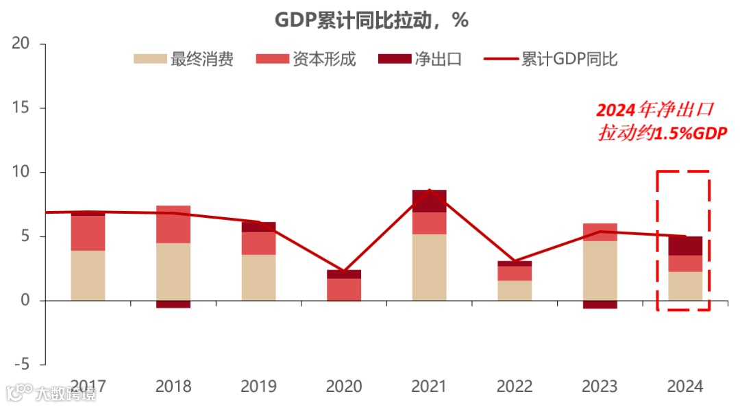 近几年我国经济增长对外需的依赖较大,2024年净出口贡献了实际GDP增长的30%。