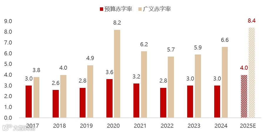 宏观政策方面,财政与货币双宽松,但以“储备政策”为主。具体来看:财政政策方面,整体扩张,但有省有花。“省”的方面,继续强调“坚持政府过紧日子”“严禁铺张浪费”“严控财政供养人员规模”等。“花”的方面,赤字率提高至4%,创历史新高。广义赤字率预计将达到8.4%,较去年提升1.8%,甚至高于2020年水平。货币政策方面,全年降息、降准仍可期待,但“适时”表明落地时机需结合内外部情况而定。