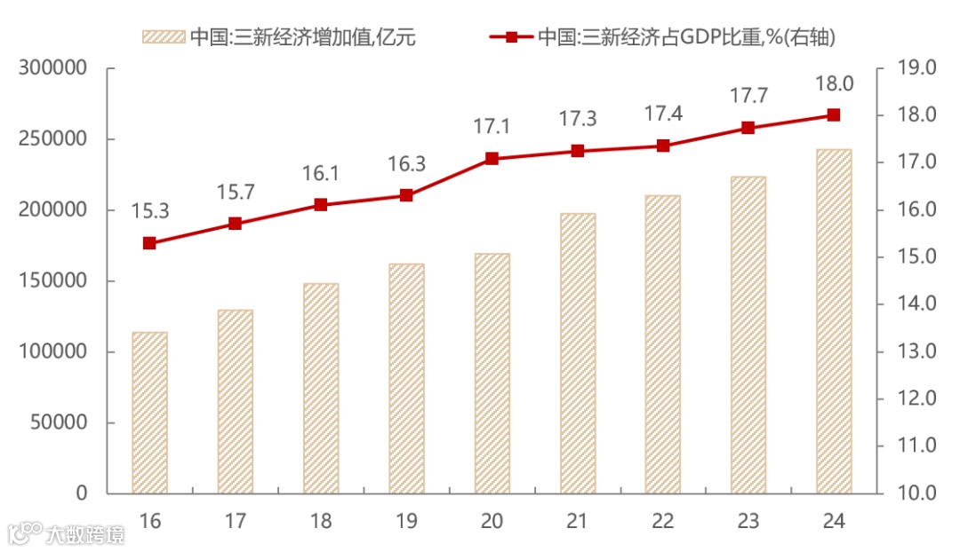 注:2024年“三新”经济占比具体数值尚未公布,此处18%是出自发改委表述“超过18%”。