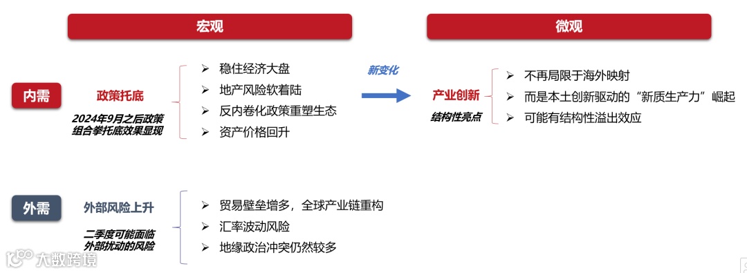 总结来看,经过三年经济结构转型的阵痛期,中国宏观经济的结构调整已经初具成效,进入“政策托底”与“创新破局”的双轮驱动阶段。一方面,经过过去三年的持续调整,地产和建筑在经济中的占比已经从2020年高点的15.3%下降到2024年的12.9%,在政策托底下,传统动能有望进入“止跌回稳”阶段,对于经济的影响有望减弱;另一方面,中国“三新”经济(新产业、新业态、新商业模式)占GDP的比重呈现持续上升趋势,2024年已经超过18%。新兴产业在经济中的重要性日渐上升。二季度面临全球产业链重构下的压力测试,需关注关税政策等外部不确定性对我国出口的直接和间接影响。