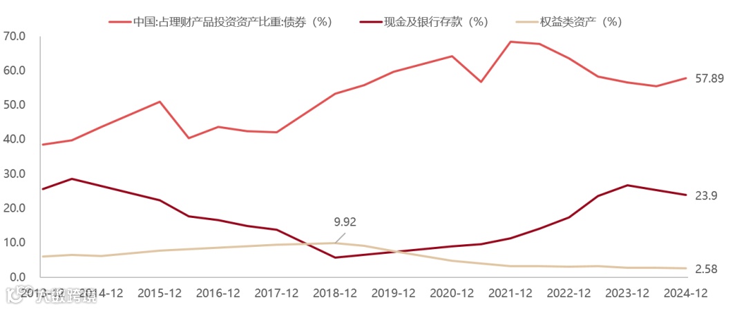 股市回报率有望吸引居民财富再配置,“存款搬家”可能成为股市的增量资金来源。截至2024年12月,我国银行理财产品资金余额为30万亿元,其中权益占比仅2.58%,为历史最低水平。随着股市回报逐步走向稳定且可预期,或推动居民存款“搬家”至权益资产。