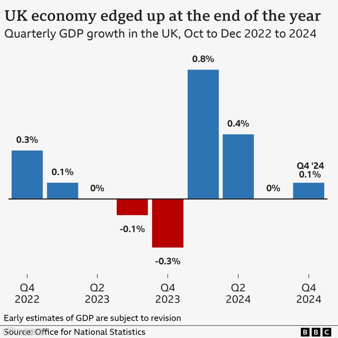 官方数据显示,英国经济在2024年最后一个季度意外增长了0.1%。路透社调查的经济学家曾预测,英国GDP在此期间将萎缩0.1%,但12月份的经济增长强于预期,为该季度带来了提振,增幅达0.4%。