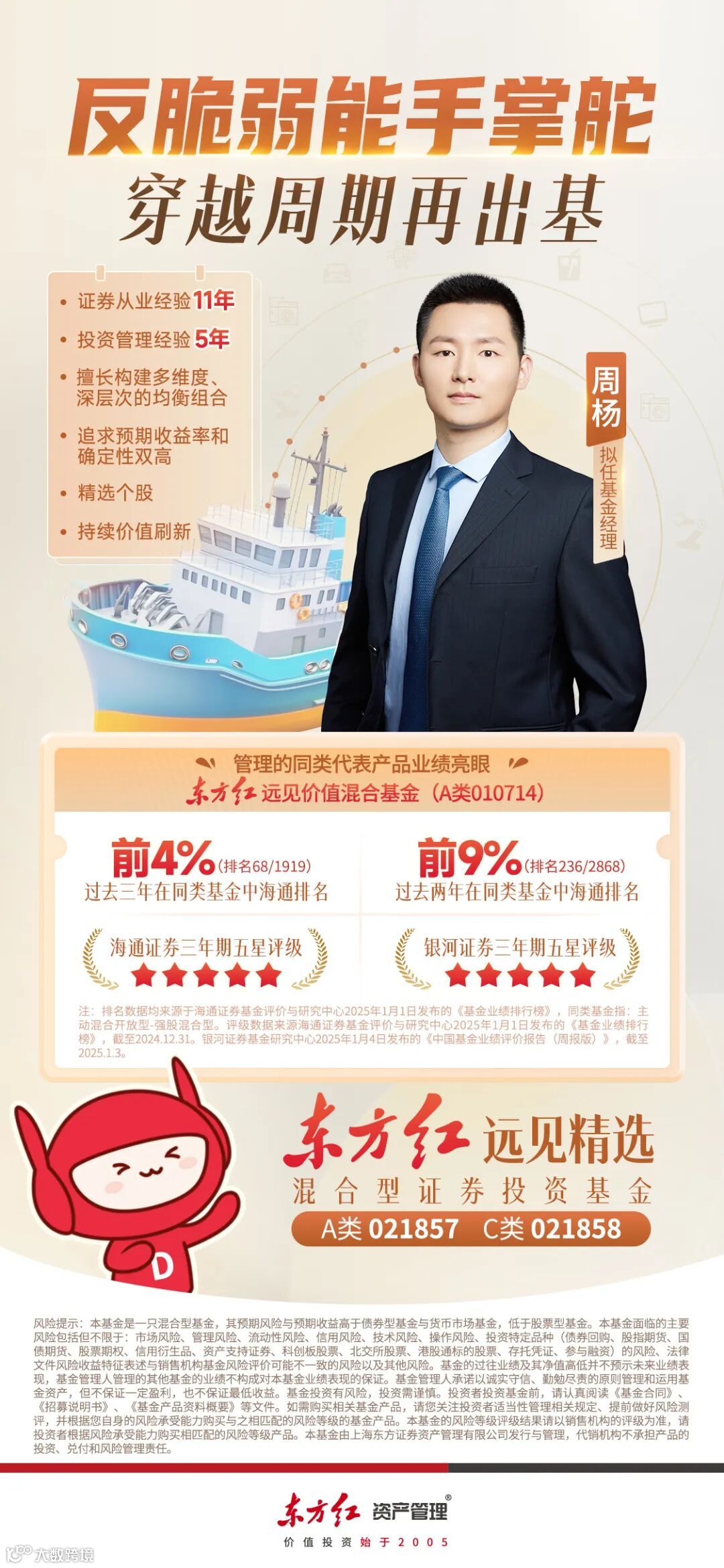 拟由周杨担任基金经理的东方红远见精选混合基金(A类:021857、C类:021858)正在发行中,力争创造优秀的中长期投资回报。
