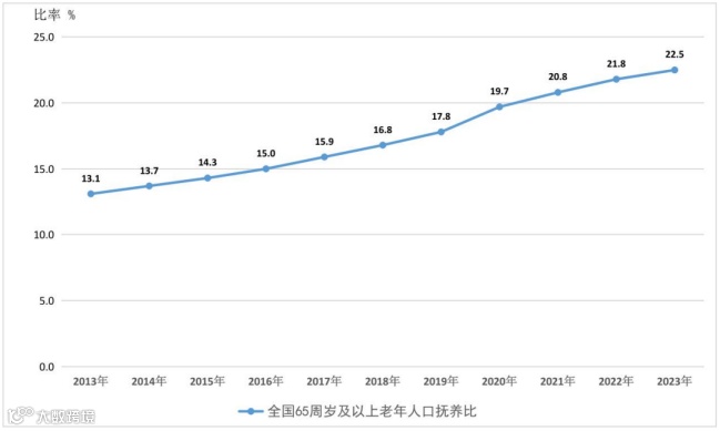 图:2013年-2023年全国65周岁及以上老年人口抚养比