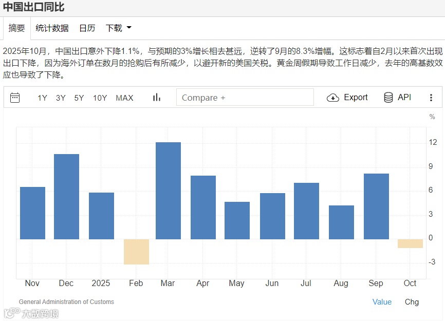 今天上午公布的数据显示,按美元计算,10月出口同比下降1.1%,较9月的8.3%增幅明显放缓,低于市场预期的3%增长。这其中,对美出口继续下降15.9%。