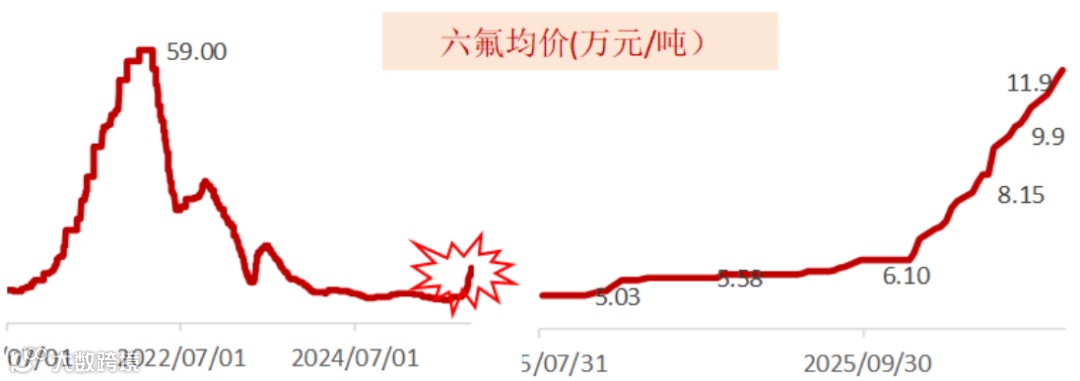今天重点谈一谈电解液。直接放图,大伙儿可以感受一下。六氟是电解液最重要的原材料,其均价逼近12万元,自底部以来涨幅140%,且近期开始加速上涨。
