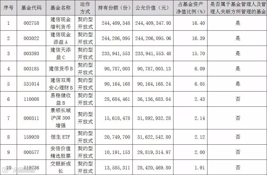 该FOF的前十大重仓基金中有五只为本公司内部产品,共占资产净值的60%,且基金类型均为货币型基金或短期理财型基金,分别为建信现金增利货币(002758)、建信现金添益A(003022)、建信天添益C(003393)、建信货币B(003185)和建信双周安心理财B(531014)等。