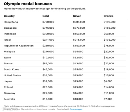 以下是美国消费者新闻与商业频道(CNBC)基于国家奥委会、体育协会和当地报道汇编的信息得到的运动员奖励参考: