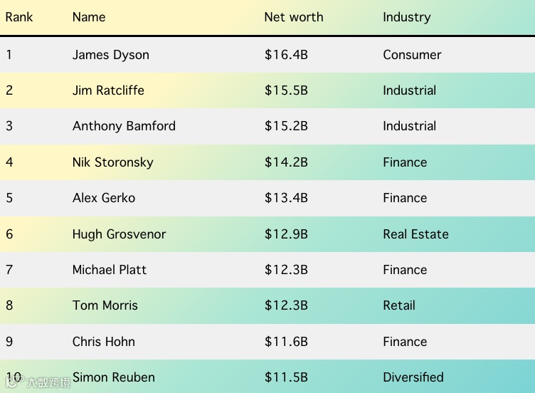 位居榜首的是将家用电器打造为全球消费科技品牌的戴森(James Dyson),坐拥约164亿美元的财富。紧随其后的是化工和能源产业英力士(Ineos)创始人吉姆·拉特克利夫(Jim Ratcliffe),其身家为155亿美元。