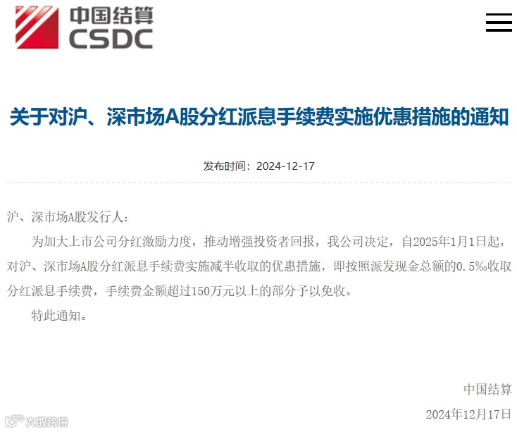 12月17日,中国结算发布消息称,为加大上市公司分红激励力度,推动增强投资者回报,中国结算决定,自2025年1月1日起,对沪、深市场A股分红派息手续费实施减半收取的优惠措施,即按照派发现金总额的0.5‰收取分红派息手续费,手续费金额超过150万元以上的部分予以免收。