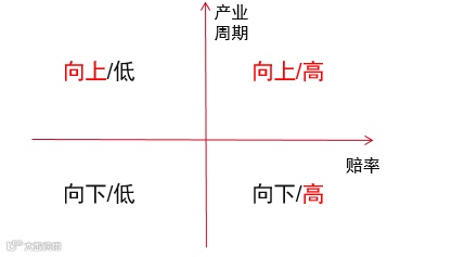 除了关注企业类型,苗宇在投资中还会引入赔率的概念,并构建了一个产业周期与赔率的四象限网络。他认为,任何时候都要考虑赔率,赔率代表了我们最大获利的可能性,上涨或者下跌并不可怕,但是如果赔率不够对于投资来说是致命的,尤其是叠加了胜率的不确定性。