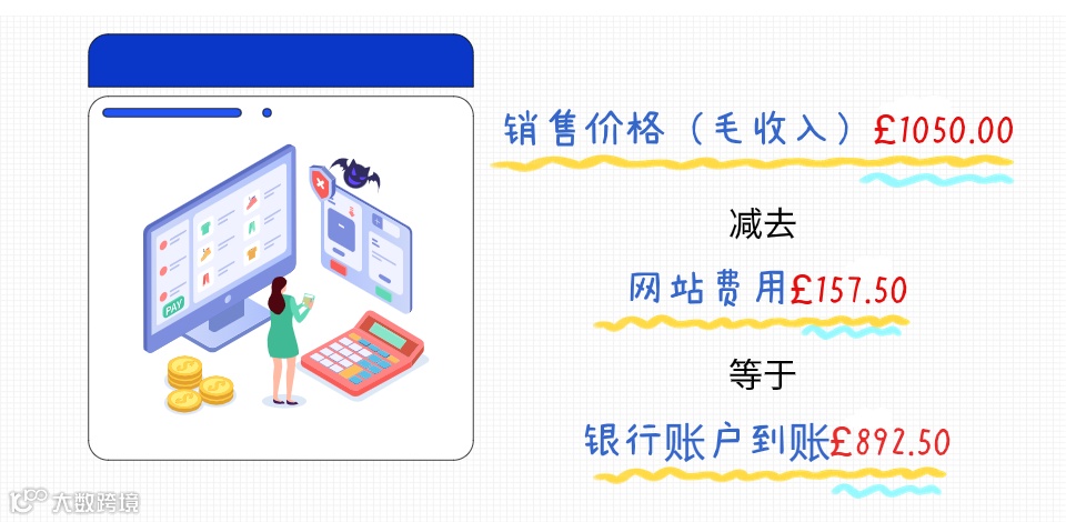 您在网上出售了一件手工艺品,收到一笔 892.50 英镑的款项,对方直接把钱打入您的银行账户。但是,该网站对销售您的商品收取 15%的费用,他们会从您的商品销售收入中扣除这笔费用,然后再支付给您。虽然您只收到 892.50 英镑,但您的总贸易收入实际上是1,050 英镑,如下所示: