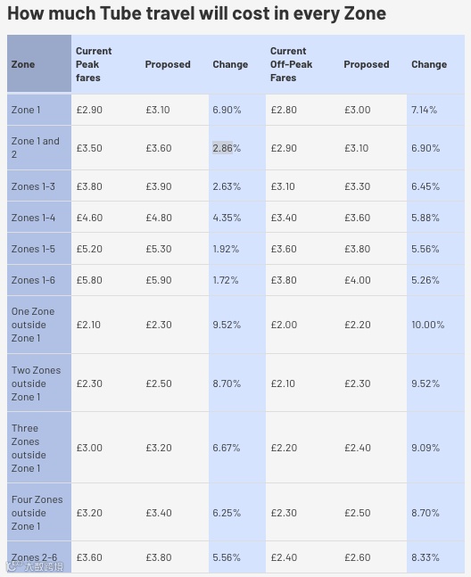 伦敦地铁票价上涨,最高涨幅达7.1%