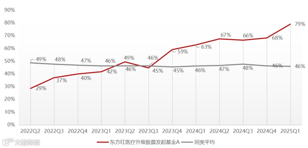 基于这一判断,江琦的策略是提高重仓股集中度,专注于少数真正具有创新力的公司,以期实现复利式的增长。数据显示,东方红医疗升级股票发起基金的前十大重仓股集中度显著提升,从2022Q4-2023Q3的40%-50%区间稳步攀升,2024年稳定在60%以上,2025Q1进一步集中到79%,通过聚焦优质企业与赛道,组合的进攻锐度得以增强。