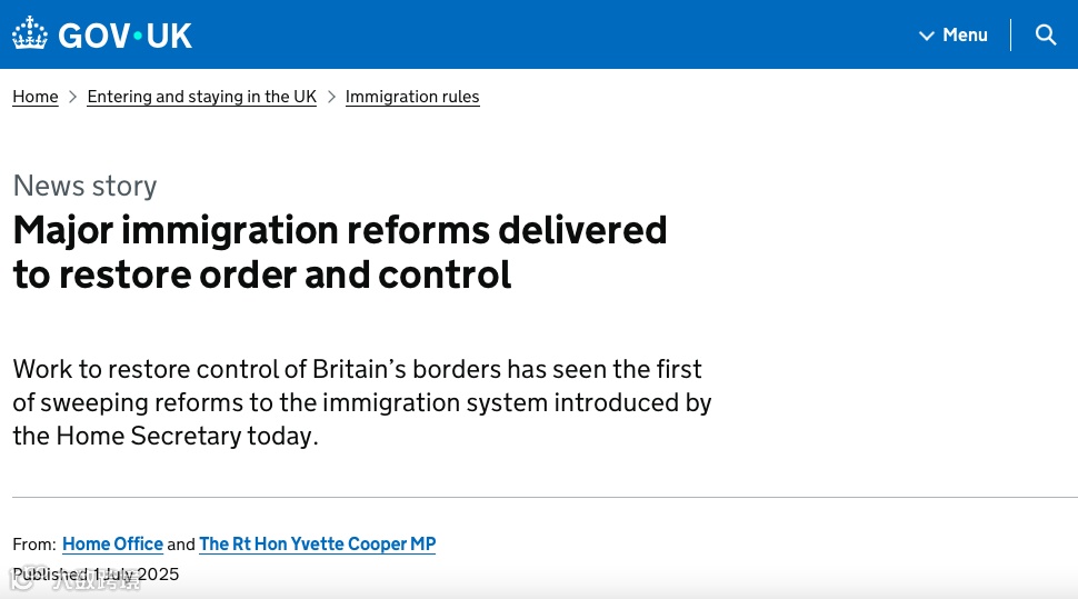 7月1日(周二),英国政府正式宣布将对现行移民体系进行大幅改革,发布长达138页的移民规则,旨在恢复对边境的有效管控,减少对海外低技能劳动力的依赖。这也是自今年5月颁布《新移民白皮书》后,工党政府首批落地实施的移民新政。