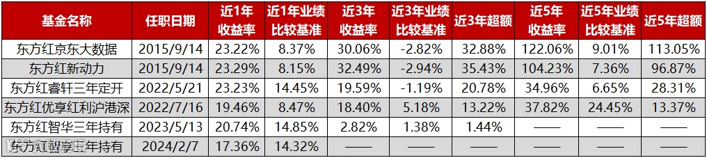 数据来源:各产品定期报告,截止2025/3/31,周云管理期间起始日为2025/9/14,东方红新动力业绩比较基准:沪深300指数收益率*70%+中国债券总指数收益率*30%;东方红京东大数据业绩比较基准:中证800指数收益率*70%+中国债券总指数收益率*30%。基金过往业绩及其净值高低并不预示未来业绩表现,其他基金的业绩不构成对本基金业绩表现的保证。