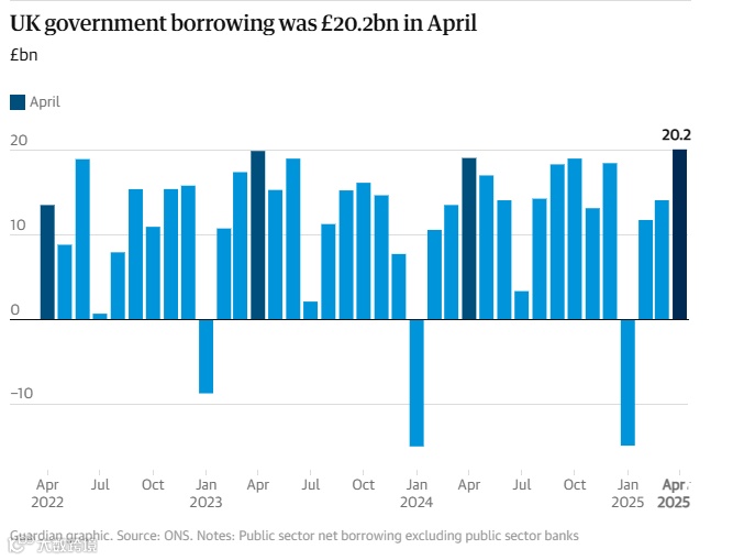 与此同时,英国政府4月份的借款额超出预期。国家统计局(ONS)表示,4月份公共部门净借款额增至202亿英镑,比去年同期增加了10亿英镑。此前,伦敦金融城的经济学家预测借款额为179亿英镑。