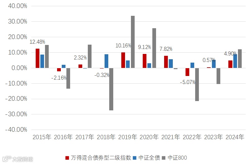 注:数据来源wind,统计区间2015.01.01—2024.12.31,混合债券型二级指数(代码885007)、中证全债(代码H11001)、中证800(代码000906)。指数历史数据仅供参考,不代表未来表现及本基金业绩表现。