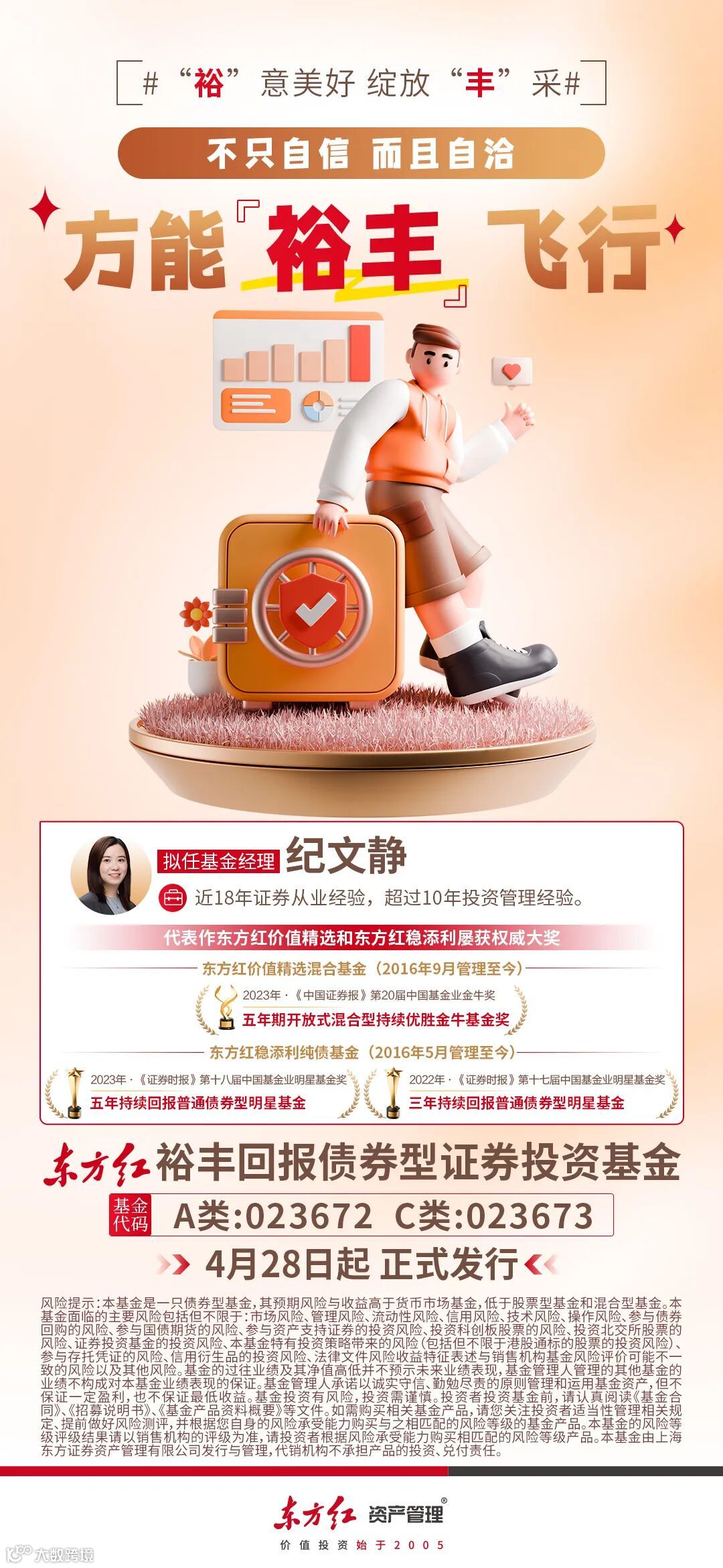 债券基金中的“全面型选手”——二级债基或是理想的选择,主要投债券,少量仓位投股票,既具有债券基金的稳健特性,又能分享权益市场的弹性收益机会。东方红资产管理推出一只全新的二级债基——东方红裕丰回报债券型证券投资基金(A类023672、C类023673),4月28日至5月21日发行,拟由资深基金经理纪文静管理,致力于为投资者提供长期稳健回报。