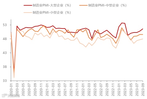 消费方面,社零同比和城镇调查失业率呈现明显的负相关关系,因此消费的修复需要密切关注就业情况。年初以来,服务业在推动国内失业率下行方面起到了重要作用,但2023Q2-Q3随着前期积压的服务消费需求集中释放后新增服务消费需求相对不强,服务业的景气度出现明显回落:服务业PMI新订单分项从3月58.5%的高点大幅回落至9月的47.4%,且对其吸纳就业产生负面影响,从业人员分项从3月48.8%的高点回落至9月的46.9%。展望2023Q4,一方面,吸纳了大量就业的中小型制造业企业景气度开始有企稳改善迹象,2023年9月的大/中/小型企业制造业PMI分别为51.6%(+0.8pct,连续第5个月企稳)/49.6%(环比持平,连续第4个月企稳)/48.0%(+0.3pct,连续第3个月回升);另一方面,随着制造业景气企稳修复并向服务业传导,服务业的景气也有望止跌回升(2023年9月服务业PMI结束4-8月连续5个月下降,环比+0.4pct),并共同带动相关就业。加之已经出台的一系列地产支持政策有望推动地产销售逐步企稳,并带动地产后周期消费品需求边际改善,预计后续整体消费有望企稳回升。
