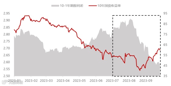 地产政策落地、地产销售金九旺季预期、季末信贷投放较好、公布的8月经济数据企稳,基本面好转不利于债市,跨季资金面的持续承压更是让收益率曲线熊平特征突出。截至9月28日,1年国债上行26BP至2.17%,10年国债上行12BP至2.68%,期限利差自65BP继续收窄至51BP,接近三年来最低水平。