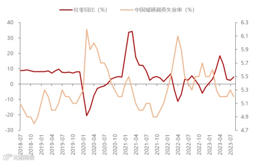图5:社零同比和城镇调查失业率呈现明显的负相关关系