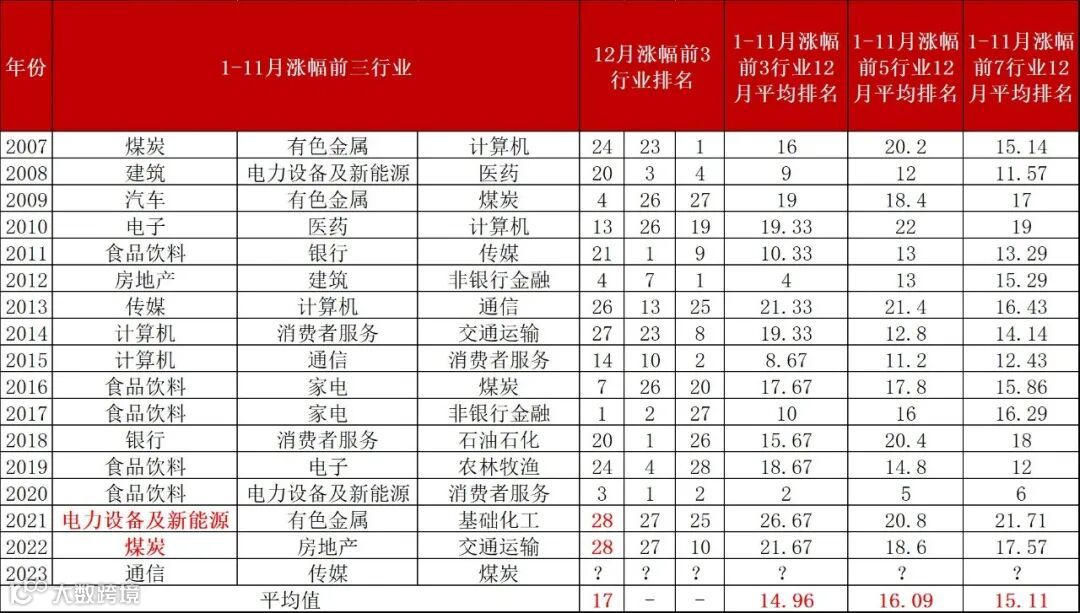 行业表现上亦呈现出明显的切换特征。我们统计28个中信一级行业(剔除综合和综合金融)指数每年1-11月的涨幅排名及其在该年12月的涨幅排名。数据显示,1-11月涨幅排名前1、3、5、7的行业在当年12月的涨幅排名平均分别为16.5、15、16.1、15.1,均低于14.5的随机排名,这意味着1-11月涨幅靠前的行业在12月通常会表现落后,市场出现明显的行业切换。在过去的2021和2022年,12月的行业切换现象则更为极端,2021年和2022年前11个月涨幅第一的“电力设备及新能源”和“煤炭”,在当年12月涨幅均垫底。