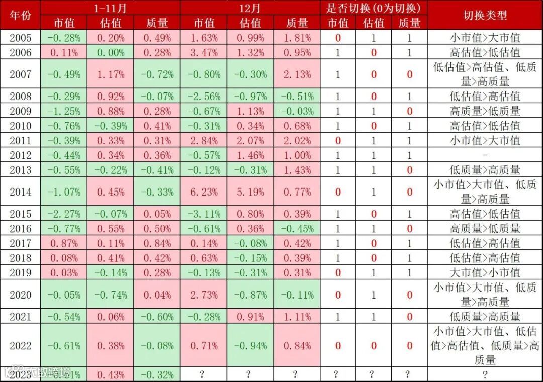 表1 2005年以来历年1-11月与12月市值、估值、质量因子收益率对比