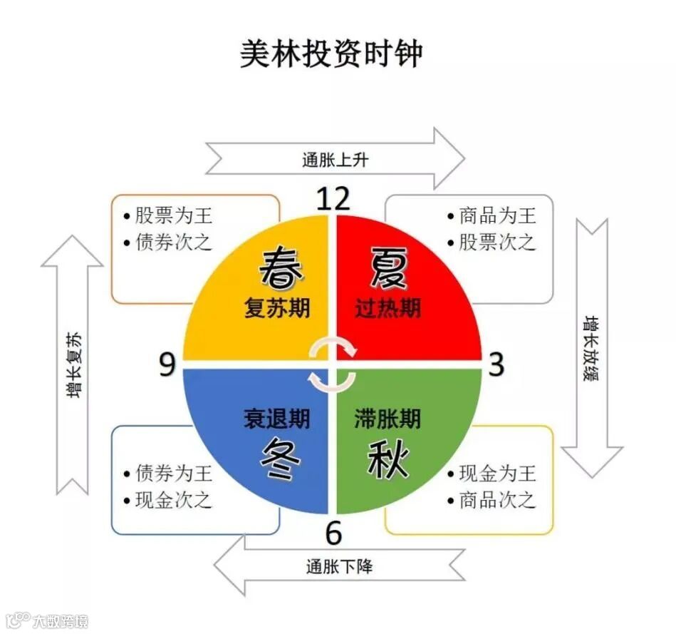 美林时钟按照经济增长速度和通胀水平,将经济环境分为四个阶段: