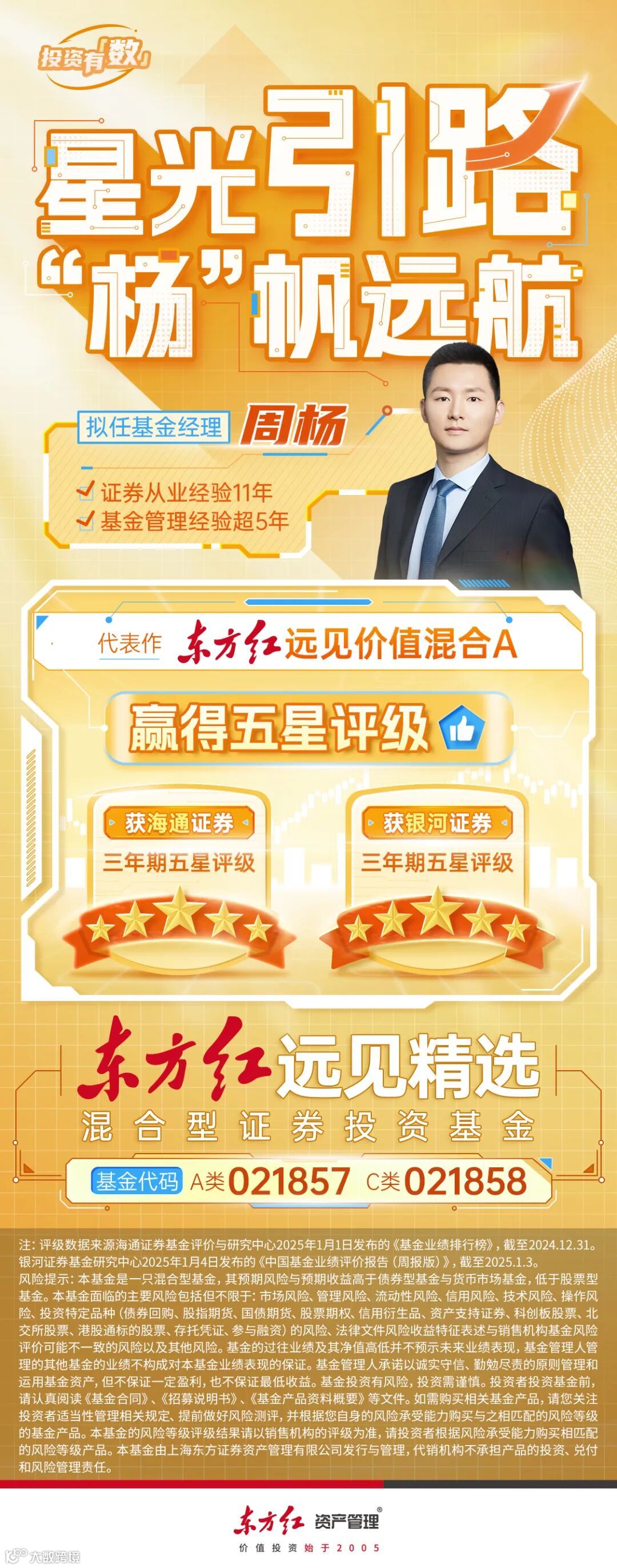 近日,拟由周杨担任基金经理的东方红远见精选混合基金(A类:021857、C类:021858)正在发行中,以客观理性和积极乐观的投资哲学,为投资者提供分享市场机遇的新工具。