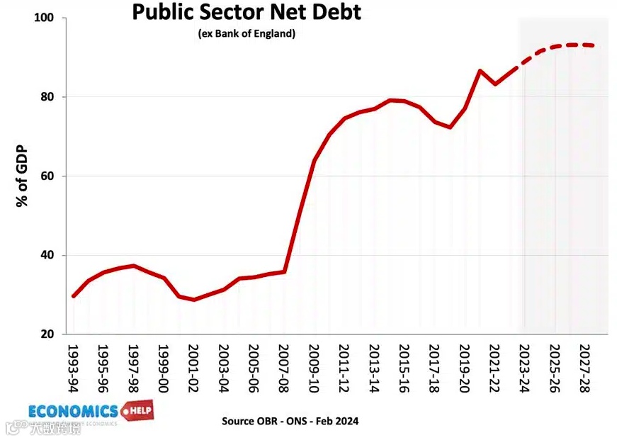 政府欠下的总金额则被称为国家债务(National Debt)。目前,英国的国家债务约为2.8万亿英镑。这个数额大致相当于英国一整年的国内生产总值(GDP),即英国在一年内生产的所有商品和服务的总价值。