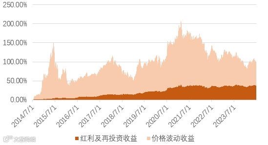 注:数据来源Wind,统计区间2014.7.1至2024.6.30。价格波动收益为沪深300指数涨跌幅,沪深300红利及再投资收益=沪深300全收益指数-沪深300指数。
