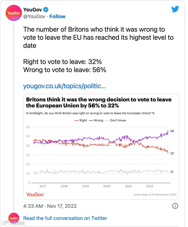 早在去年十一月,在You Gov的一项民调显示,56%的人表示英国在2016年投票决定离开欧盟是“错误的”,仅32%的人认为这是个正确决定。24个百分点的差距是2016年以来该系列调查中最大的。此外,近五分之一曾在公投中支持脱欧的选民表示,脱欧是个错误决定,这也是该系列调查中的最高纪录。
