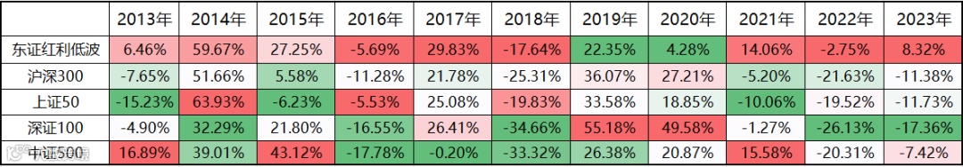 数据来源:Wind,数据区间为2013.1.1-2023.12.31,以上色阶表示在同一年中,红色越深则代表当年收益越好,绿色越深则代表当年收益约差。指数收益历史数据仅供参考,不代表未来表现,与本基金收益无关。