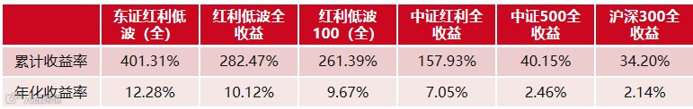 红利策略作为“压舱石”瞄准稳定的现金流,力争投资收益的稳定性。截至2024年4月30日,中证东方红红利低波动全收益指数达到5013.06点,累计收益率达401.31%,年化收益率为12.28%。同区间中证红利低波动全收益指数,累计收益率为282.47%,年化收益率为10.12%。