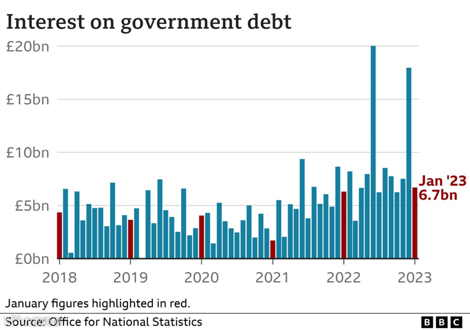 许多经济学家担心,政府借贷太多,代价很大,其中最让人担心的就是利息。据了解,政府在一月份支付了67亿英镑的债务利息。这是有史以来最大的一月利息支出。但这比它在2022年12月支付的173亿英镑的利息或在2022年6月支付的194亿英镑要少得多。预计政府在2022年和2023年的债务利息支出将超过1000亿英镑--比它在教育方面的支出还要多。
