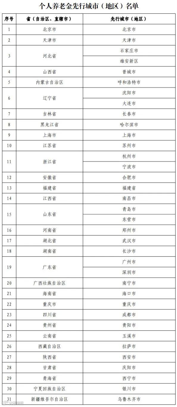 人力资源社会保障部办公厅、财政部办公厅、国家税务总局办公厅11月25日发布《关于公布个人养老金先行城市(地区)的通知》。