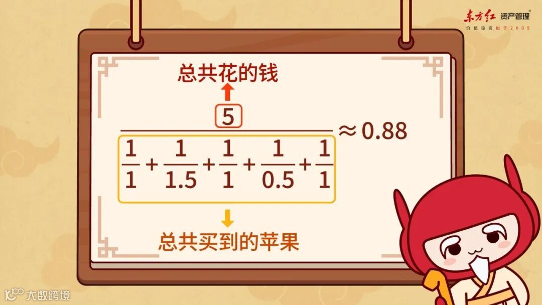 假如每天拿1元钱去买苹果,而五天下来,苹果的价钱分别是1元、1.5元、1元、0.5元、1元,那平均买入成本是多少?