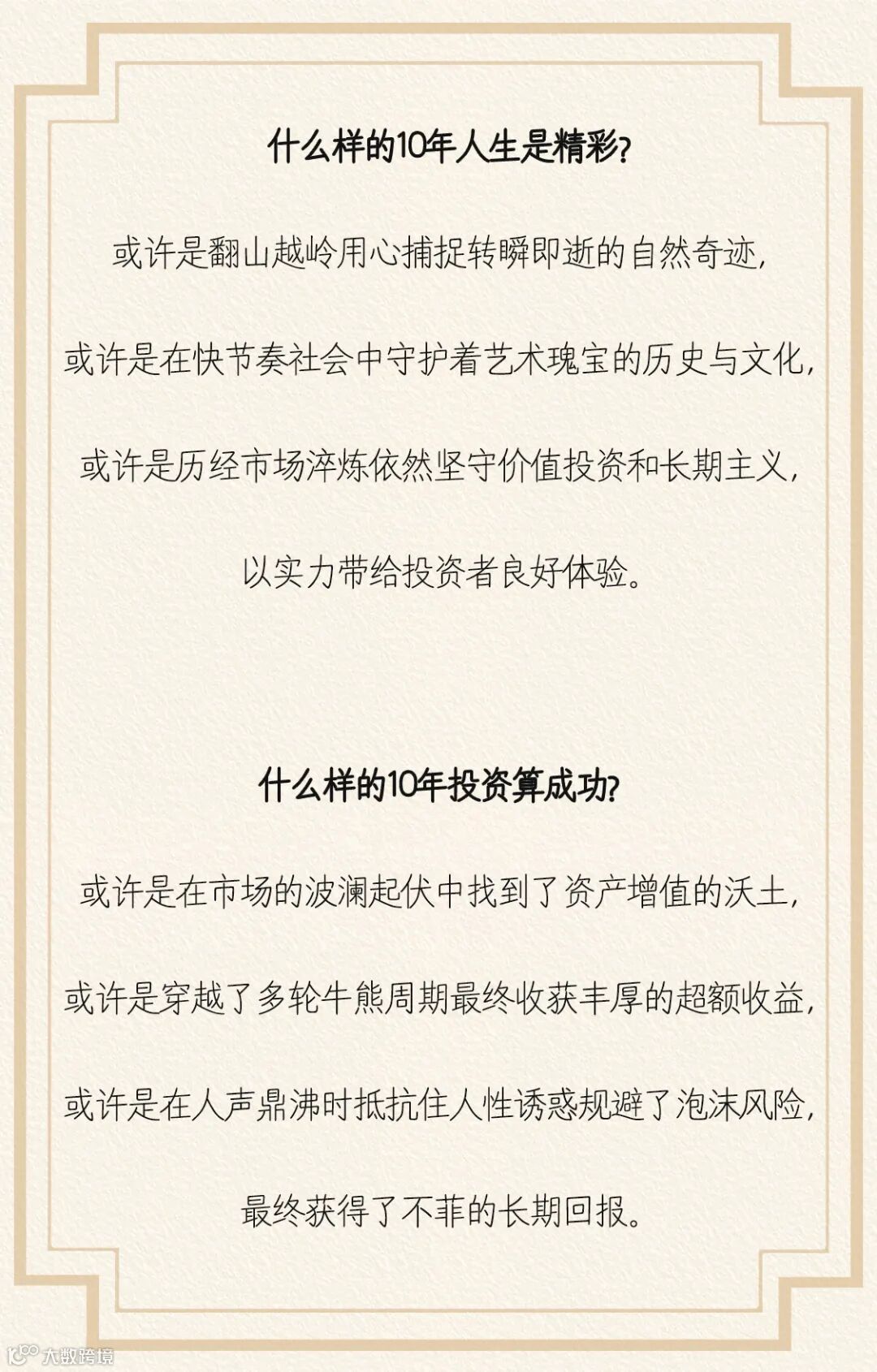 无论人生旅途还是投资范式,不同的人都有着不同的定义,而时间是其中唯一不变的变量。十年之于人的一辈子,不过是一小段时光。投资亦是如此,虽然每一天、每一分钟的交易都构成了市场波动本身,投资者时刻经历着跌宕起伏,但如果我们以十年为单位回顾资本市场的浩浩荡荡,会发现任何一天的惊涛骇浪都只是历史长河中的一朵小浪花。