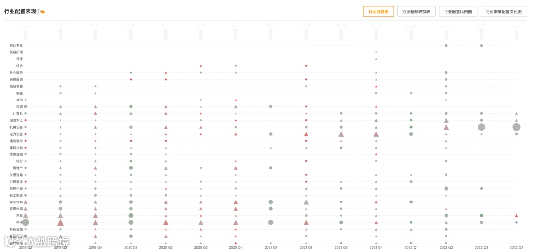 从周杨的这些选股案例来看,他以寻找“幸运的行业、能干的公司、合理的价格”为出发点,在过去几年里找到了制造业里的多个独家牛股。从下方周杨的行业能力圈可以看到,在过去几年制造业、新能源的牛市中,周杨在相关行业的投资能力发挥得相当明显;与此同时,在家电、地产、电子等行业上的表现也十分出色。但最重要的是,行业配置只是周杨的“阶段性结果”,他独特的反脆弱投资框架才是核心驱动力。