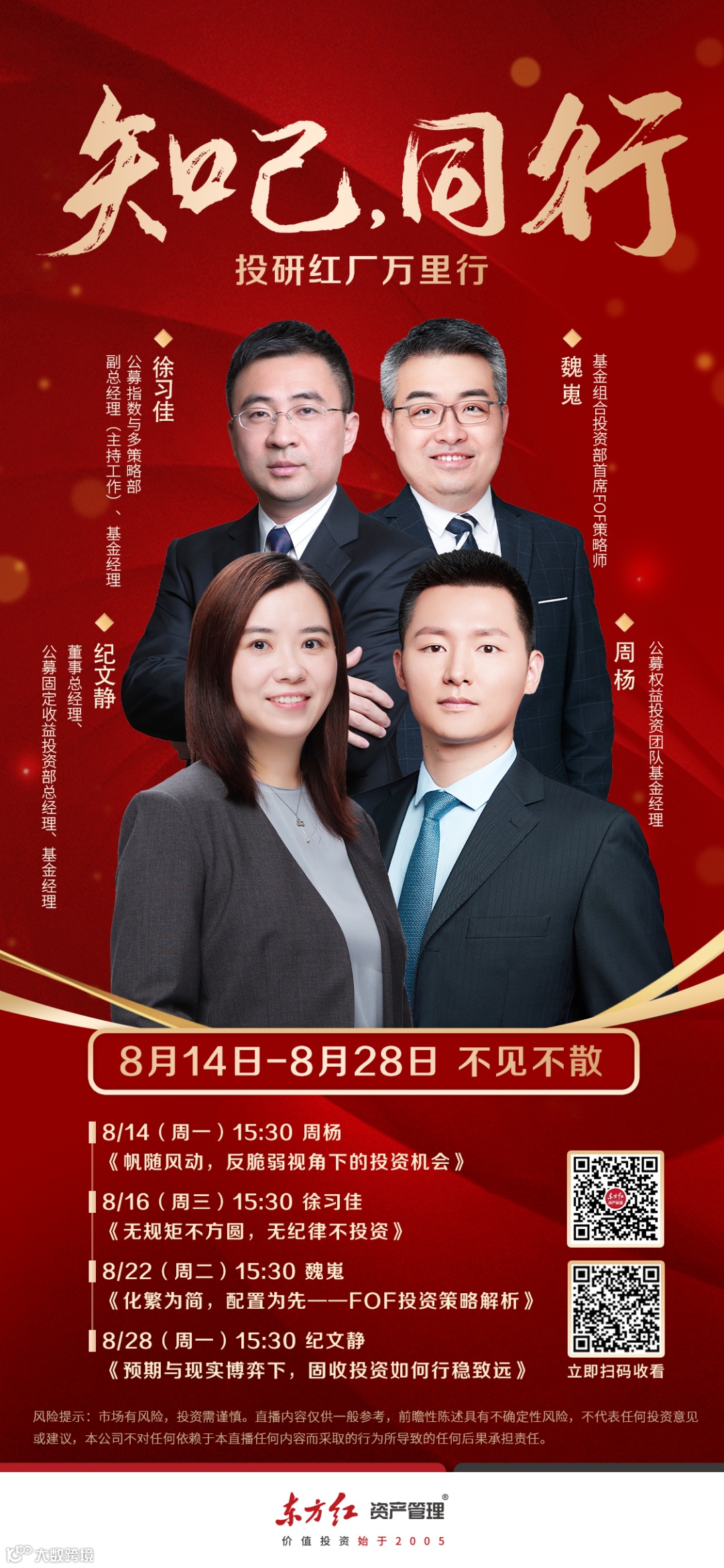 8月14日起为期三周,东方红资产管理直播间——《知己,同行》投研红厂万里行系列联播,将邀请来自东方红权益、固收、FOF、指数团队的基金经理周杨、纪文静、徐习佳以及首席FOF策略师魏嵬联合发声,为广大投资者朋友带来资本市场投资策略的最新解读。扫描上方海报中的二维码,一键解锁四场知己之约。